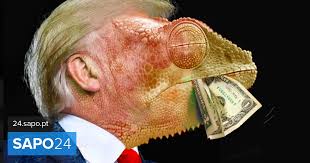 Desenho do presidente dos EUA, Donald Trump, com cara de camaleão e a língua feita com uma nota de dólar, é a caricatura da autoria de Luc Descheemarker, que hoje venceu o 1.º Prêmio do PortoCartoon 2019.